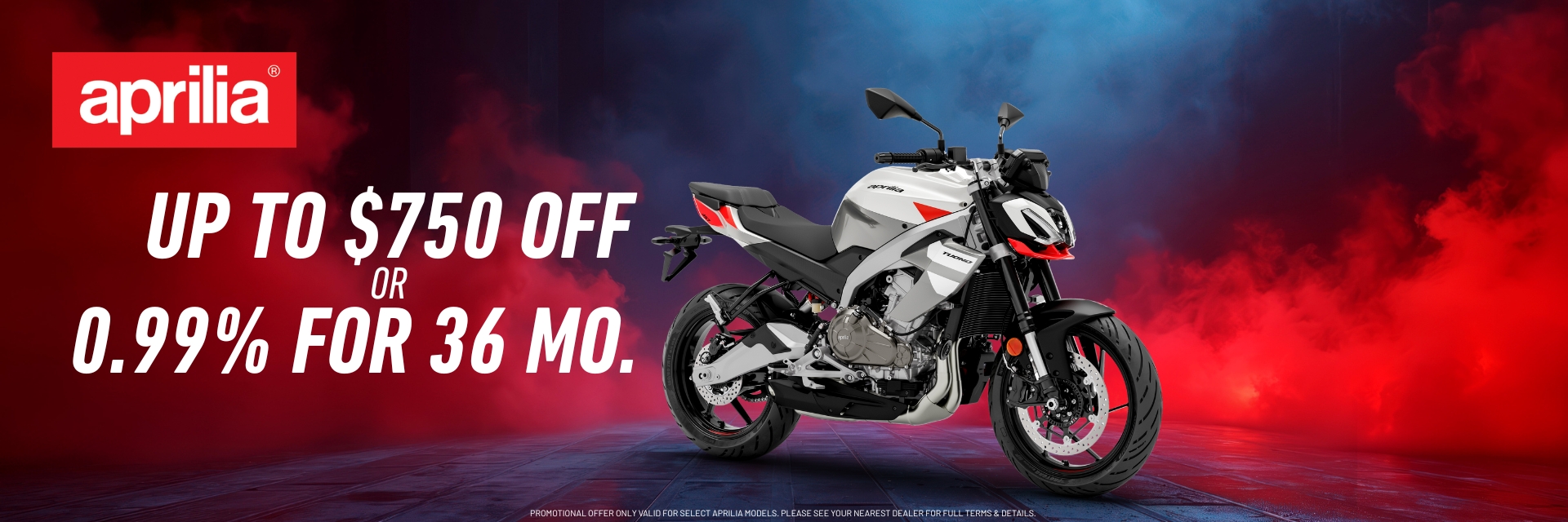Kick off the new year with special offers on a new Aprilia! For a limited time take advantage of financing as low as 0.99% APR or up to $750 performance credit on select models! Head over to your local Aprilia dealer today for more details. Offers are valid only from January 1st, 2026, through March 31st, 2026, at participating dealers and vary based upon model.