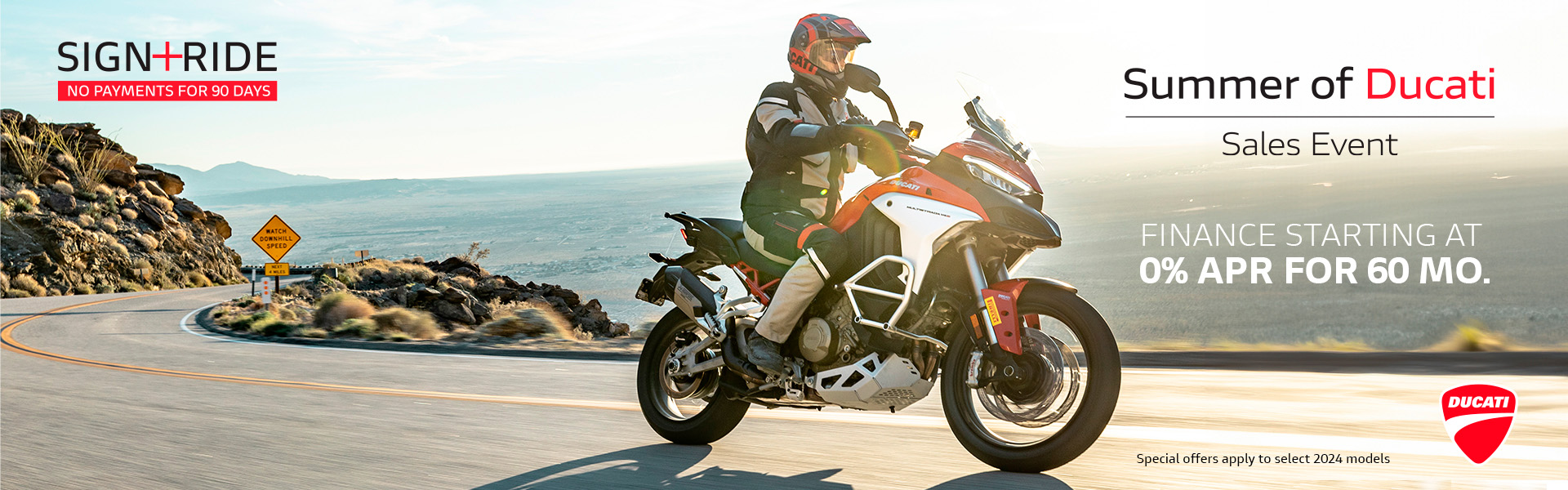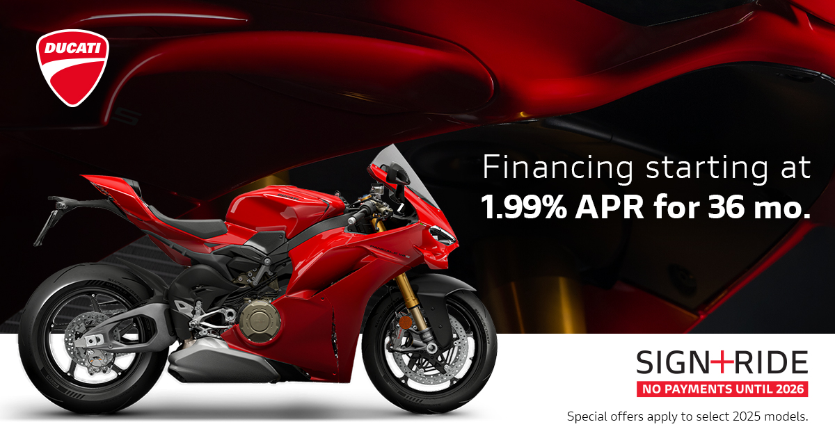 Offer available on select 2024 and 2025 models to highly qualified customers on approved credit by Ducati Financial Services through participating and authorized Ducati dealers from October 1 - 31, 2025. Down payment requirement varies from 0%-25% of the purchase price based on credit worthiness. Not all customers will qualify for the advertised APR. Minimum amount financed is $5,000. See your local Ducati dealer for financing details or, for general product information, call 1-888-391-5446. VW Credit, Inc. dba Ducati Financial Services is a servicer for VCI Loan Services, LLC. © 2025 Ducati North America.