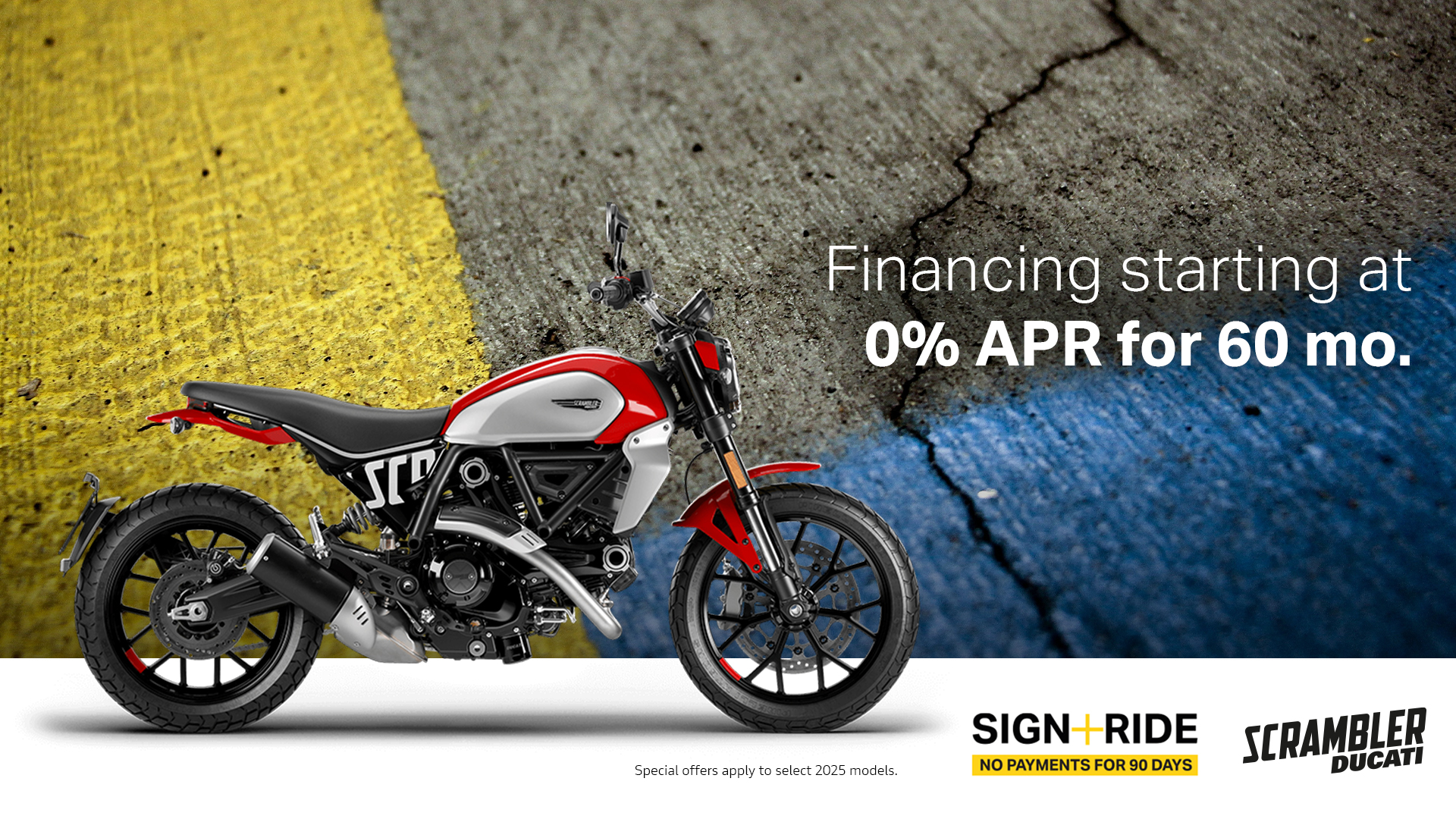 Offer available on select 2025 models to highly qualified customers on approved credit by Ducati Financial Services through participating and authorized Ducati dealers from January 6 - 31, 2026. Down payment requirement varies from 0%-25% of the purchase price based on credit worthiness. Not all customers will qualify for the advertised APR. Minimum amount financed is $5,000. See your local Ducati dealer for financing details or, for general product information, call 1-888-391-5446. VW Credit, Inc. dba Ducati Financial Services is a servicer for VCI Loan Services, LLC. © 2025 Ducati North America.