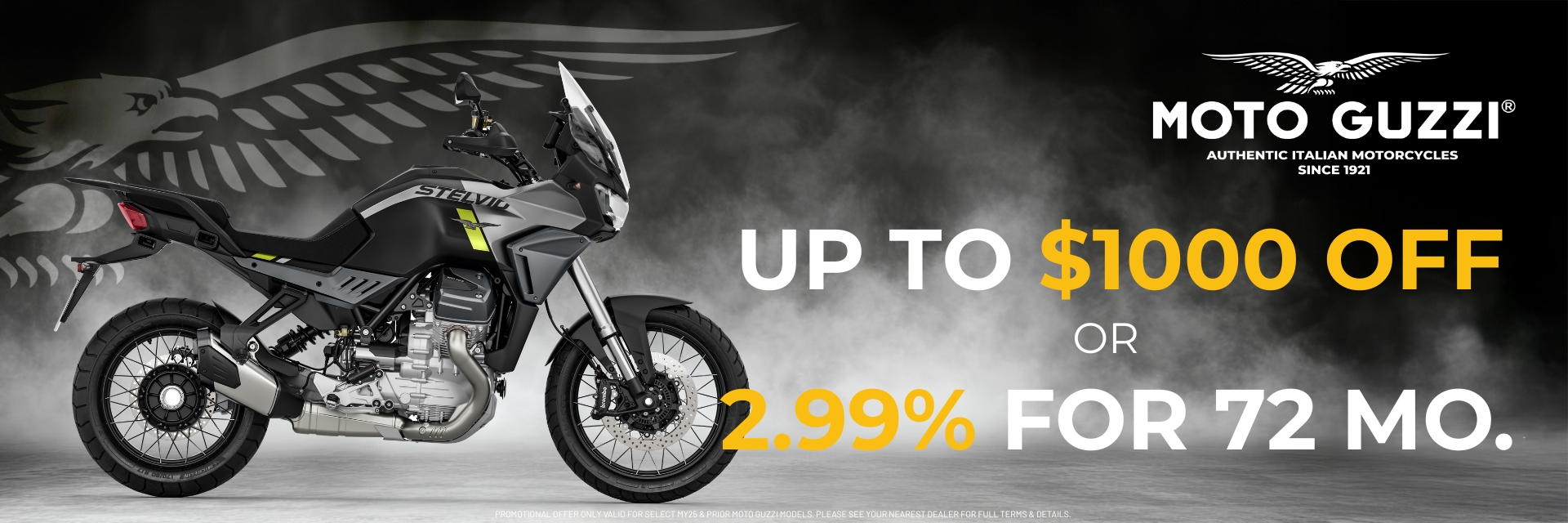 Kick off the new year with special offers on a new Moto Guzzi! For a limited time take advantage of financing as low as 2.99% APR or up to $1,000 performance credit on select Moto Guzzi models. The promotions are only valid from January 1st, 2026, until March 31st, 2026, on select Moto Guzzi models and varies by model.
