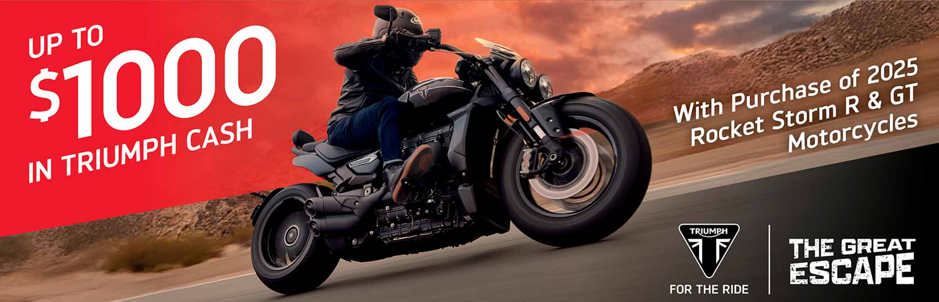 The Great Escape promotion offers bold incentives for riders to escape high interest rates on the purchase of a new Triumph motorcycle, with the lowest financing rates in the industry. Below is a summary of the January offers.